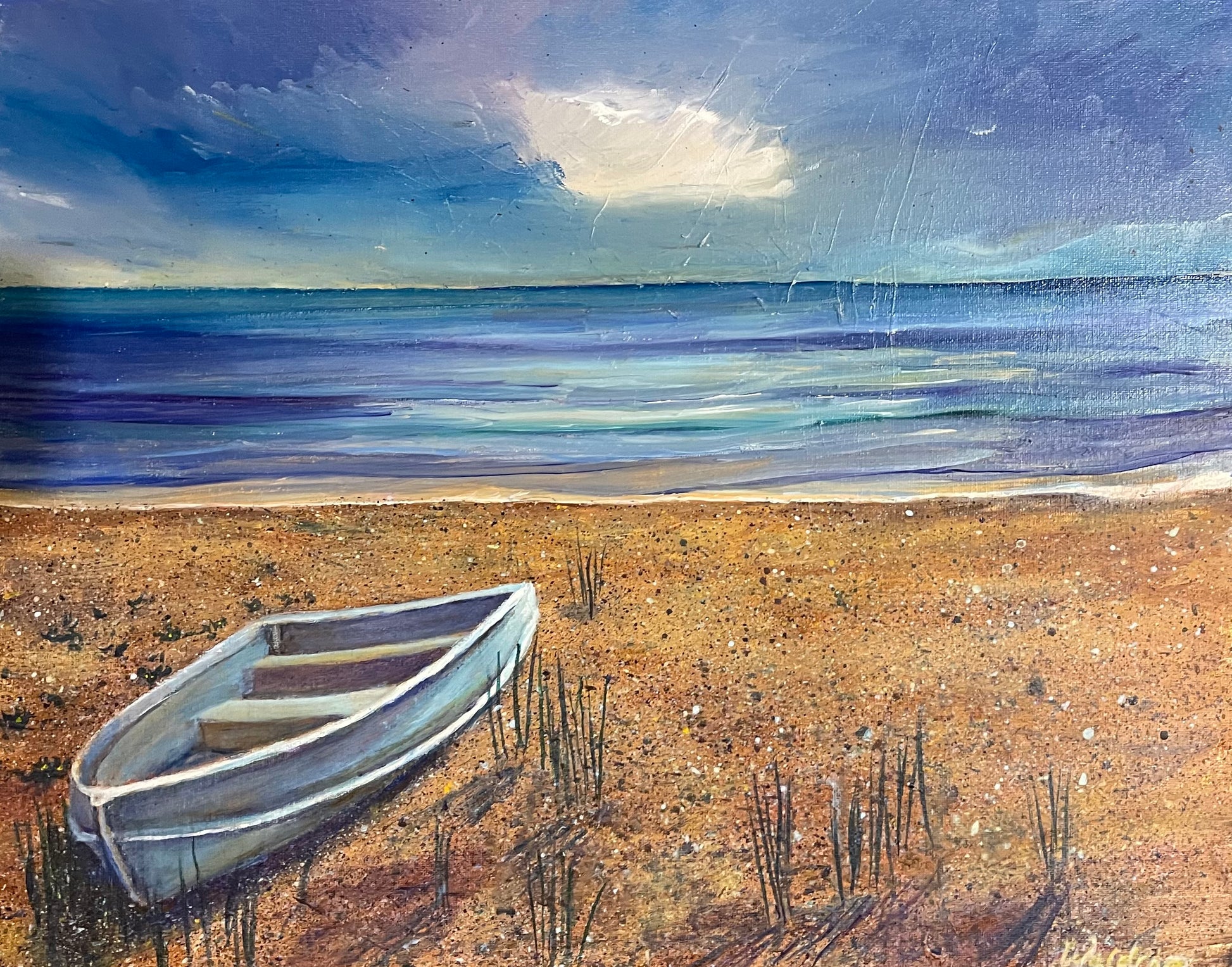 In the evening, a rowboat rests on the shores of a great lake, with the beauty of water and sky represented in complementary colors. 18 X 24 inches, gallery wrap canvas.