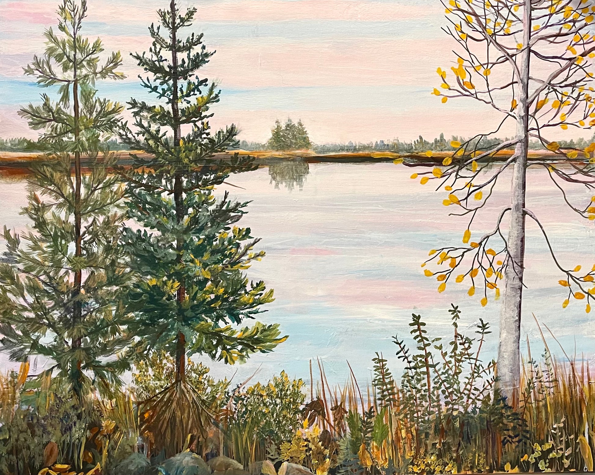 Fall on Lake Huron is beautiful, and this painting captures the evening light on the water, and the trees surrounding it, using a limited palette approach that highlights the fall colors.